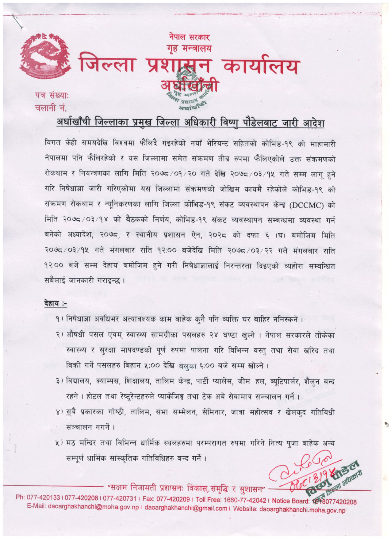 सन्धिखर्क, अर्घाखाँची (अर्घाखाँचीडट्कम) । अर्घाखाँची जिल्लामा सातौ पटक पुन: असार २२ गतेसम्म निषेधाज्ञा थपिएको छ।