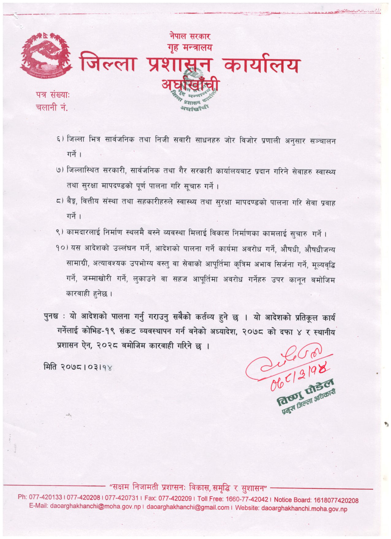 जिल्ला प्रशासन कार्यालयका अनुसार जिल्लामा सातौ पटक आजदेखि असार २२ गते मंगलबार राती १२ बजेसम्म एक हप्ता निषेधाज्ञा थपिएको हो । भने भोली असार १६ गतेदेखि जिल्ला भित्र निजी तथा सार्वजनिक सवारी साधन जोर-बिजोरमा चल्न पाउने भएका छन् । ती सवारीलाई जनस्वास्थ्यका मापदण्ड पालना गरेर सिट क्षमताअनुसार जोर बिजोरअनुसार चलाउन दिने निर्णय भएको हो ।