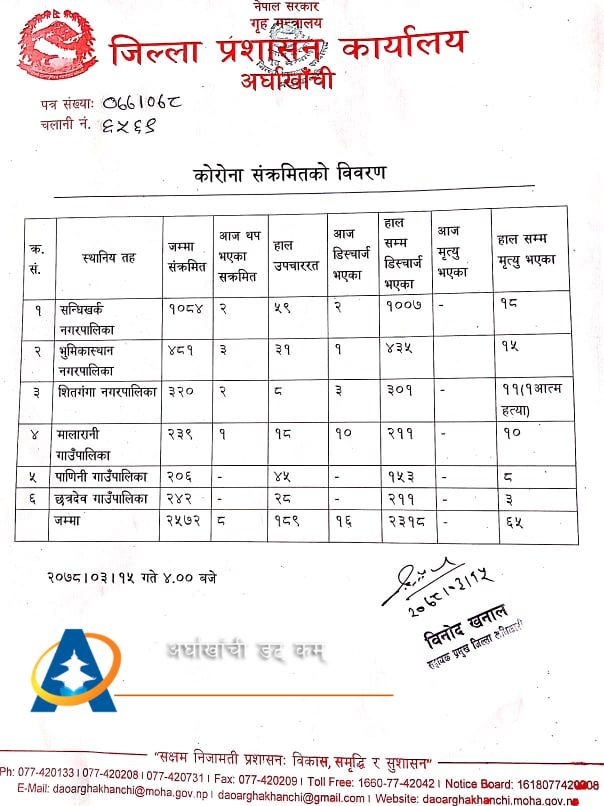 सन्धिखर्क, अर्घाखाँची (अर्घाखाँचीडट्कम) । अर्घाखाँची जिल्लामा पछिल्लो २४ घण्टामा थप ८ जना कोरोना संक्रमित थपिएका छन् ।