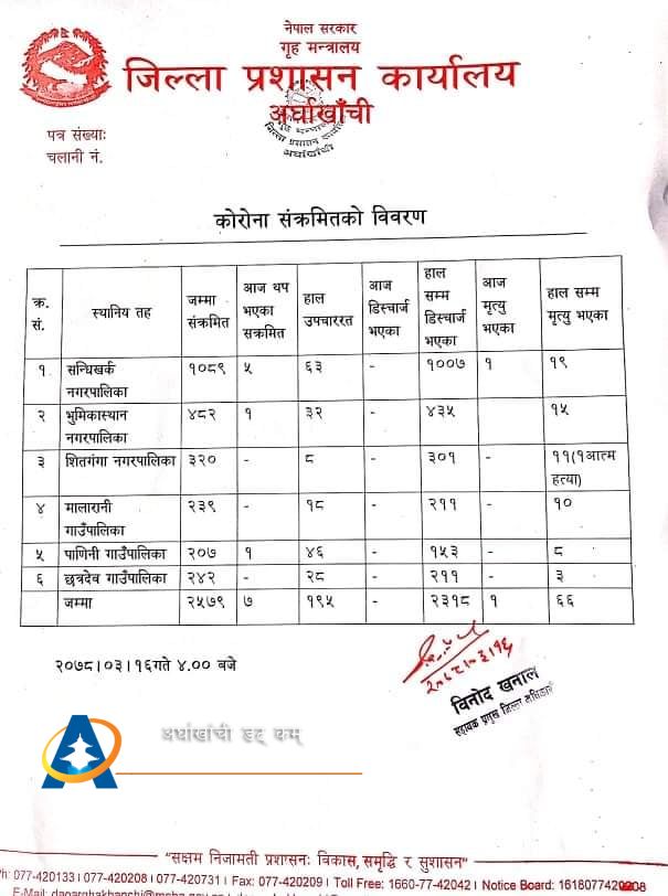 सन्धिखर्क, अर्घाखाँची (अर्घाखाँचीडट्कम) । अर्घाखाँची जिल्लाको सन्धिखर्क नगरपालिका वार्ड नम्बर ६ नरपानीकी १ जना बृद्धाको कोरोना संक्रमितको निधन भएको छ ।