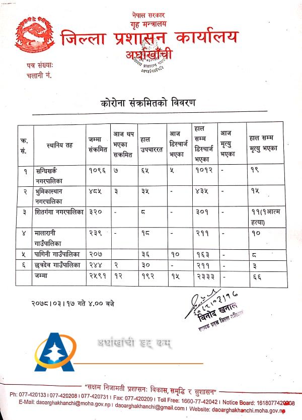 यस्तै जिल्ला प्रशासन कार्यालयका अनुसार काेराेना संक्रमणका कारण जिल्लामा गतवर्षदेखि हालसम्म ६६ जनाको ज्यान गएको छ । जसमा सन्धिखर्क नगरपालिकामा १९ जना, भूमिकास्थान नगरपालिकामा १५, शितगंगा नगरपालिकामा १ जना आत्महत्या सहित ११, मालारानी गाउँपालिकामा १०, पाणिनी गाउँपालिकामा ८ र छत्रदेव गाउँपालिकामा ३ जना संक्रमित रहेका छन् ।