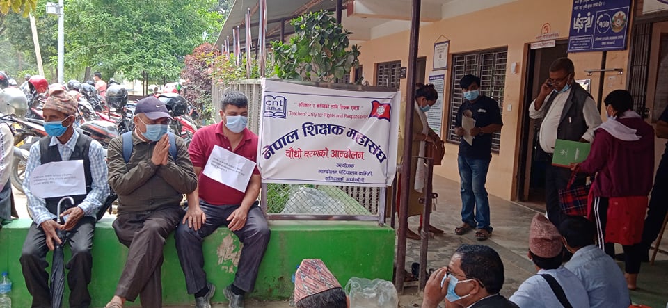सन्धिखर्क, अर्घाखाँची (अर्घाखाँचीडट्कम) । नेपाल शिक्षक महासंघले आफ्नो मागहरु पूरा गर्न  भन्दै देशभरका स्थानिय तह अगाडि आज धर्ना कार्यक्रम गरेको छ ।