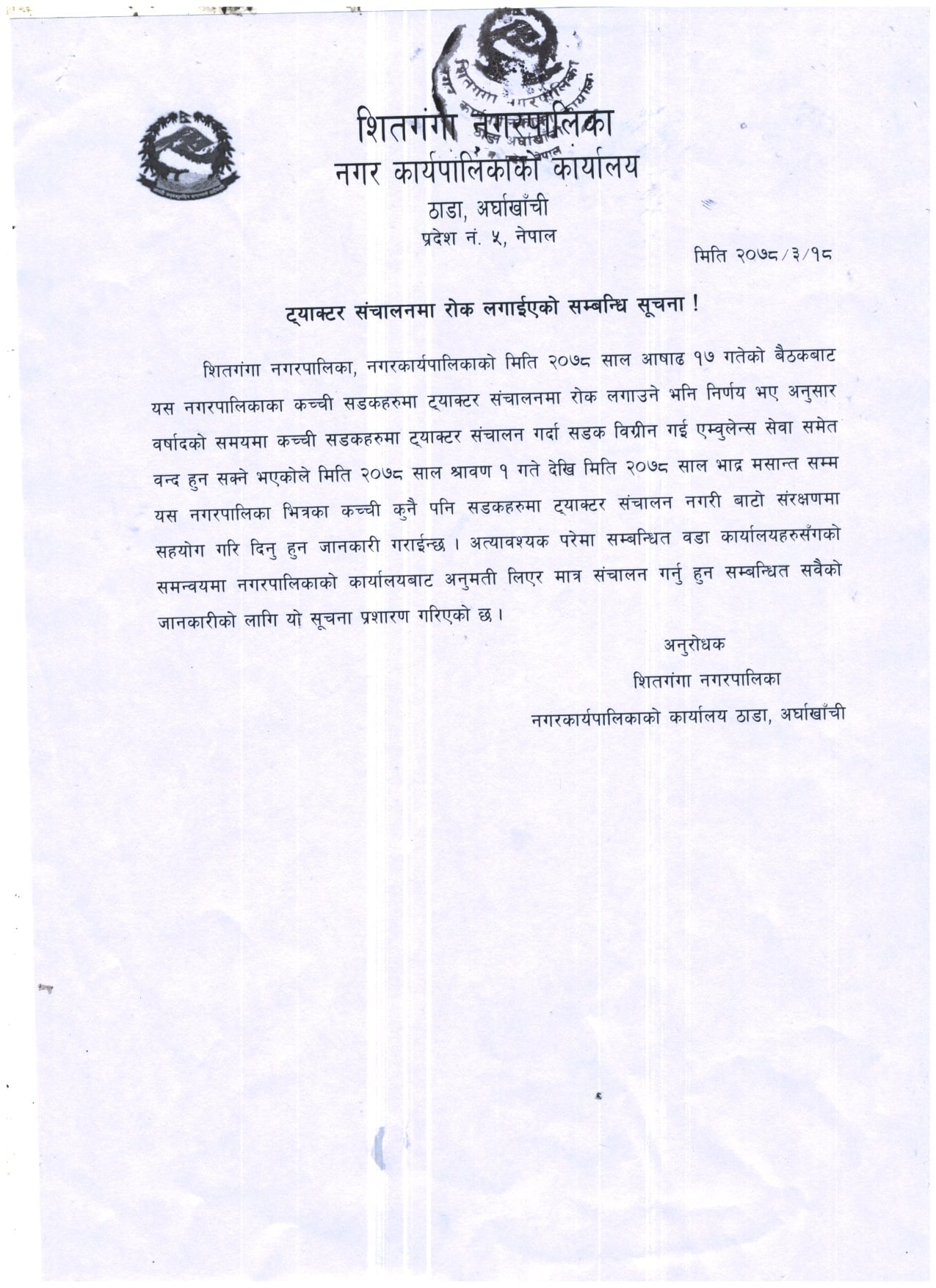 जारी गरेको सूचनामा वर्षाका कारण सडक क्षतविक्षत भएकाले आउँदो भदौ ३० गतेसम्म नगरभरका कच्ची सडकमा ट्याक्टर र ठूला सवारीसाधन सञ्चालन नगर्न भनिएको छ। सूचना अटेर गरी चलाए नियमानुसार कारबाही हुने सूचनामा उल्लेख छ ।
