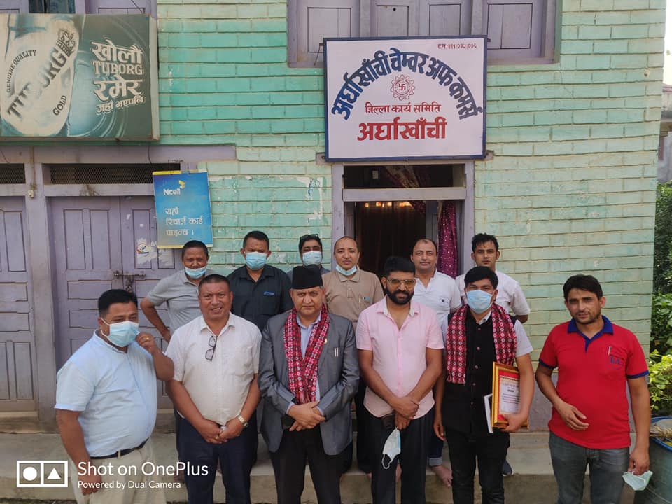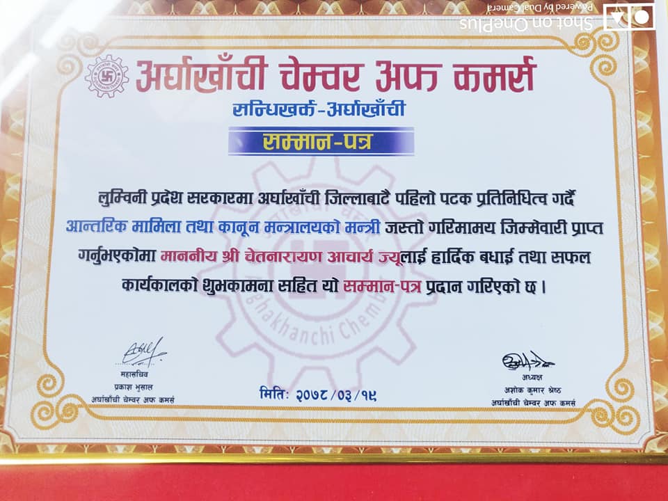 अर्घाखाँची चेम्बर अफ कमर्सले सन्धिखर्कमा आज शनिबार एक कार्यक्रमको आयोजना गरी लुम्बिनी प्रदेशका आन्तरिक मामिला तथा कानुन मन्त्री चेतनारायण आचार्यलाई सम्मान गरेकाे हो ।