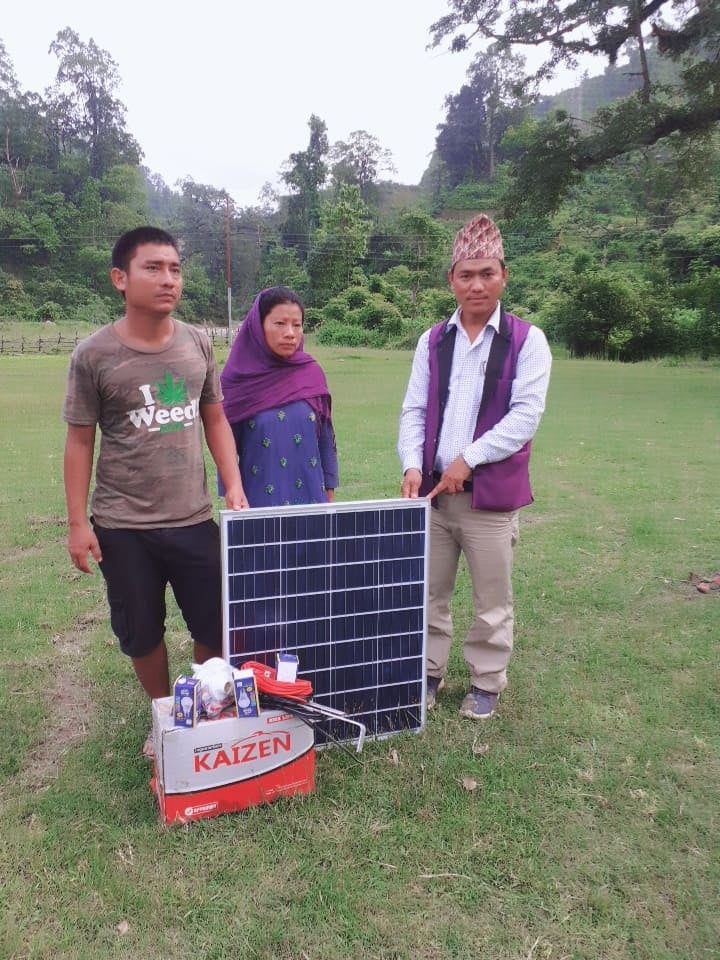 सिद्धाराको बाेक्से गाइधाट चिउरिदमार बेलदमारका दुर्गम भेगका परिवारलाई निःशुल्क ६५ सेट सोलार वितरण गरिएको हो ।