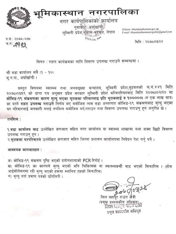 सन्धिखर्क, अर्घाखाँची (अर्घाखाँचीडट्कम) । अर्घाखाँची जिल्लाका स्थानिय निकायहरुले कोरोना संक्रमणका कारण मृत्यु भएका परिवारलाई एक लाख रुपैया राहत वितरण गर्ने भएका छन् ।