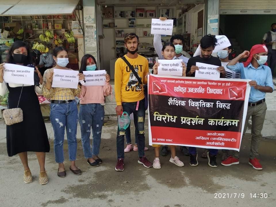 सन्धिखर्क, अर्घाखाँची (अर्घाखाँचीडट्कम) । अर्घाखाँची जिल्लाको सन्धिखर्कमा विप्लब नेतृत्वको नेपाल कम्युनिस्ट पार्टीको भातृ जनबर्गीय संगठन अखिल क्रान्तिकारी अर्घाखाँचीले शैक्षिक विकृतिका विरुद विरोध प्रर्दशन कार्यक्रम सम्पन्न गरेको छ ।