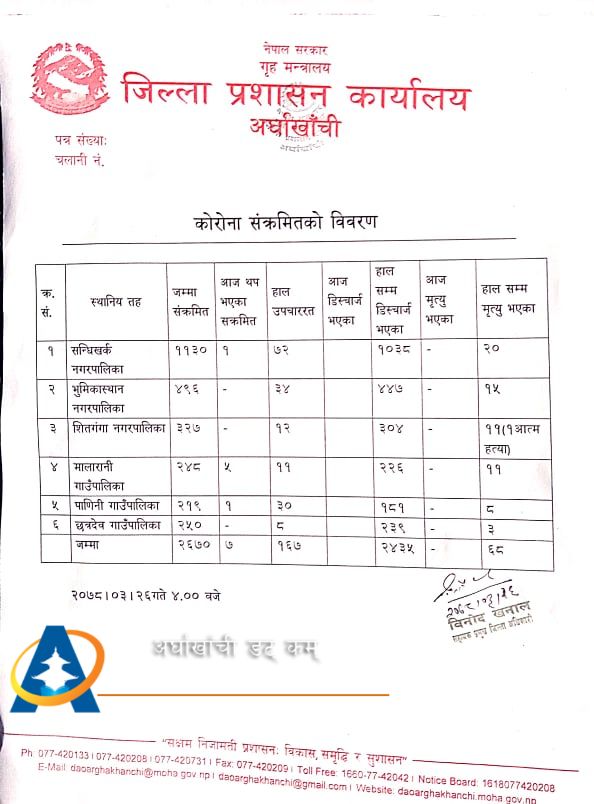 सन्धिखर्क, अर्घाखाँची (अर्घाखाँचीडट्कम) । अर्घाखाँची जिल्लामा पछिल्लो २४ घण्टामा थप ७ जना कोरोना संक्रमित थपिएका छन् ।