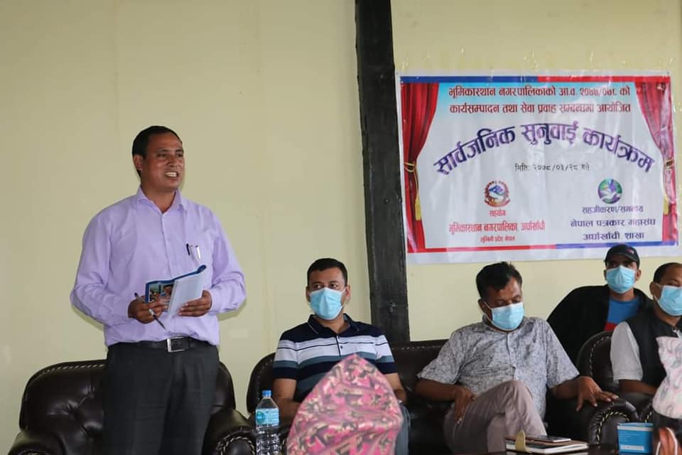भूमिकास्थान नगरपालिकामा सोमबार सार्वजनिक सुनुवाई कार्यक्रम सम्पन्न भएको हो ।  सुनुवाई कार्यक्रमको सहजीकरण नेपाल पत्रकार महासंघ अर्घाखाँचीले गरेको थियो ।