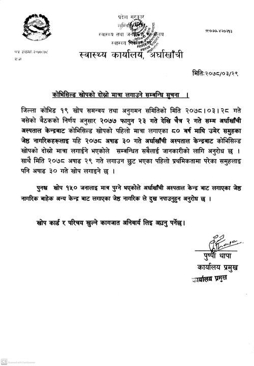 सन्धिखर्क, अर्घाखाँची (अर्घाखाँचीडट्कम) । अर्घाखाँची जिल्ला स्वास्थ्य कार्यालयले यही असार ३० गते कोभिसिल्ड खोपको दोस्रो मात्रा लगाईदिने भएको छ ।