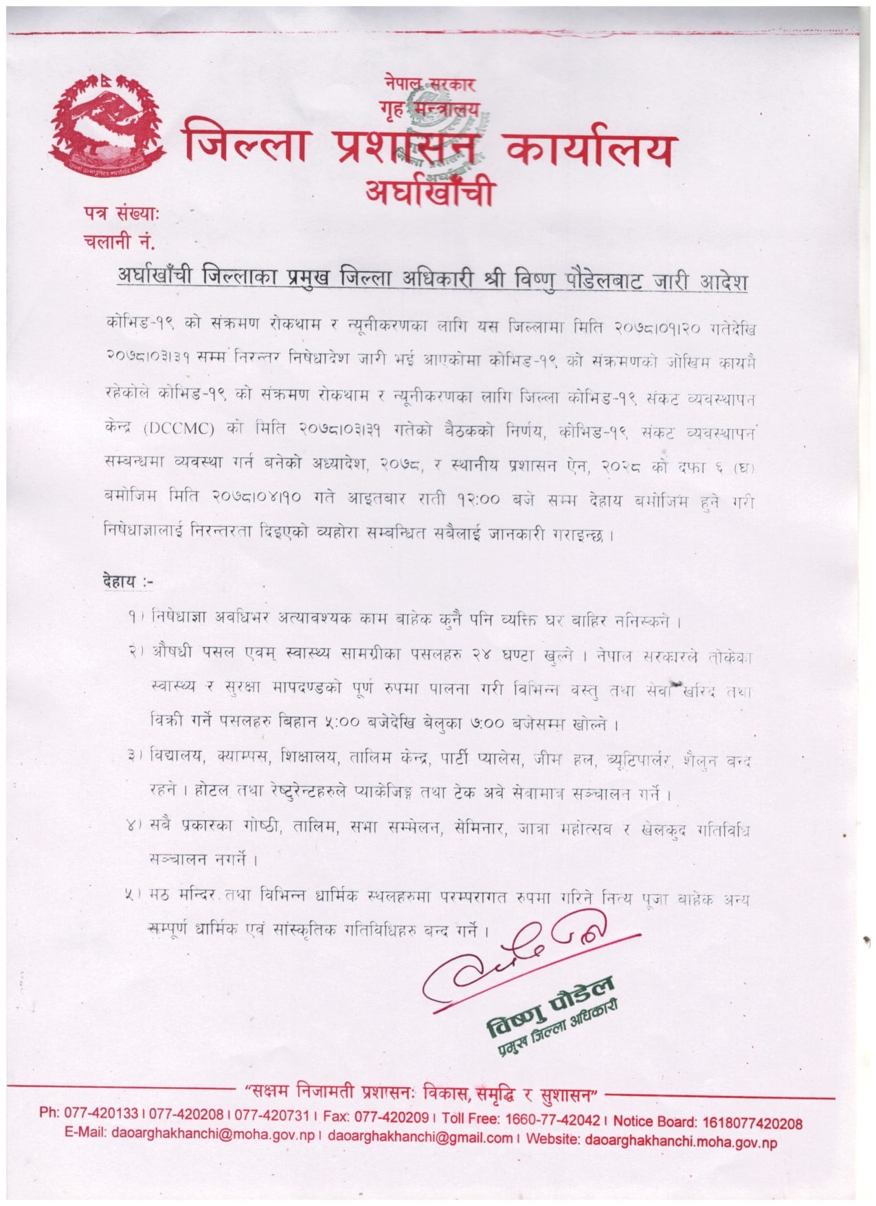 सन्धिखर्क, अर्घाखाँची (अर्घाखाँचीडट्कम) । अर्घाखाँची जिल्लामा नवौ पटक पुन: साउन १० गतेसम्म निषेधाज्ञा थपिएको छ।