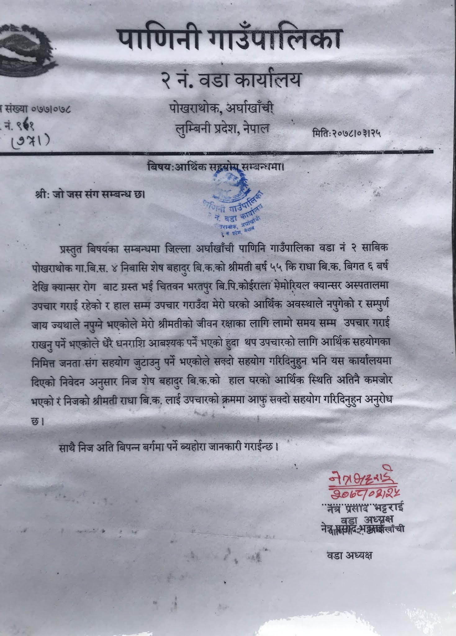 साथै निज अतिबिपन्न बर्गमा पर्ने ब्यहोरा  पाणिनि गाँउ पालिका वडा नं २ का वडा अध्यक्ष नेत्र प्रसाद भट्टराई ले सहयोगको लागी सिफ़ारिश गरेकोपत्रमा उल्लेख गरिएको छ ।”