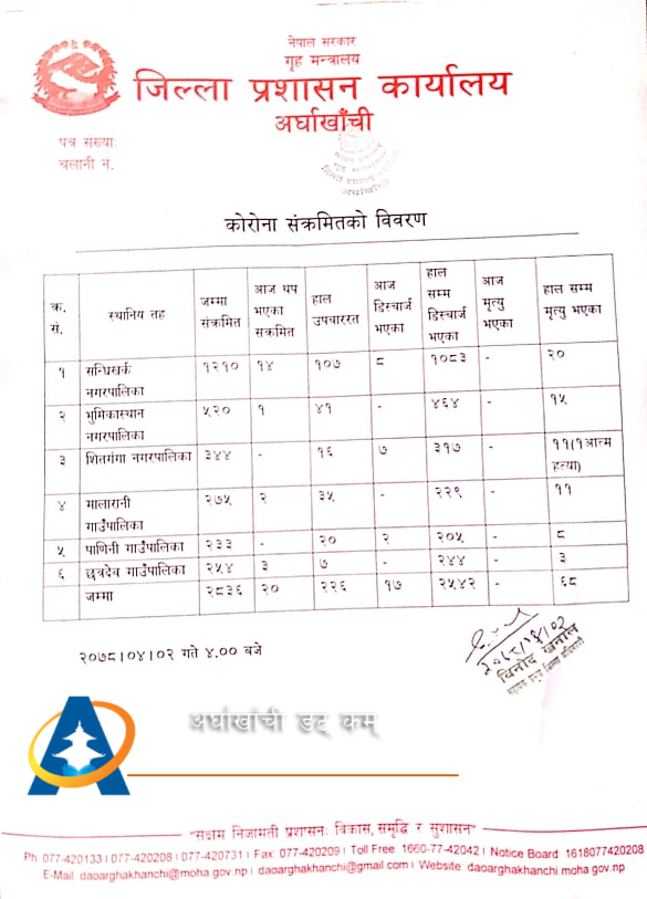 सन्धिखर्क, अर्घाखाँची (अर्घाखाँचीडट्कम) । अर्घाखाँची जिल्लामा पछिल्लो २४ घण्टामा थप २० जना कोरोना संक्रमित थपिएका छन् ।