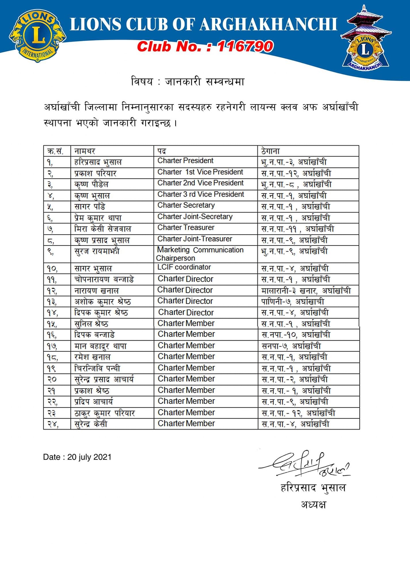 लायन्स क्लव अफ अर्घाखाँचीले मंगलवार हरि प्रसाद भुसालको अध्यक्षमा २४  सदस्यीय नयाँ समिती गठन गरेको हो ।