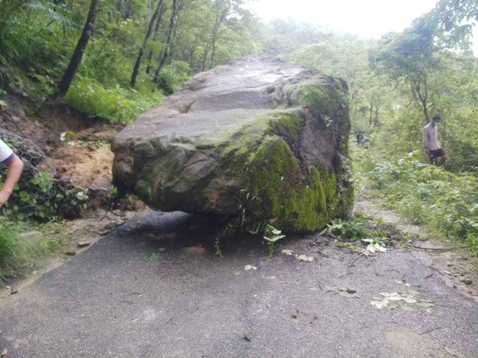 सडकमा पहिरो सहित ठूलो ढुङ्गा खसेको थियो ।