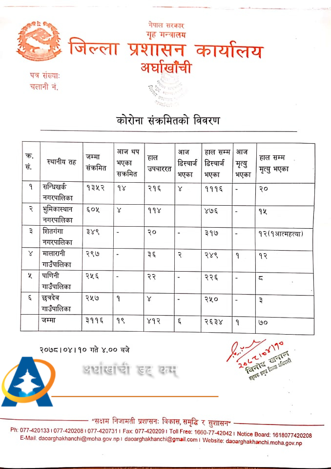 यो सँगै काेराेना संक्रमणका कारण जिल्लामा गतवर्षदेखि हालसम्म ७१ जनाको ज्यान गएको छ । जसमा सन्धिखर्क नगरपालिकामा २१ जना, भूमिकास्थान नगरपालिकामा १५, शितगंगा नगरपालिकामा १ जना आत्महत्या सहित १२, मालारानी गाउँपालिकामा १२, पाणिनी गाउँपालिकामा ८ र छत्रदेव गाउँपालिकामा ३ जना संक्रमित रहेका छन् ।