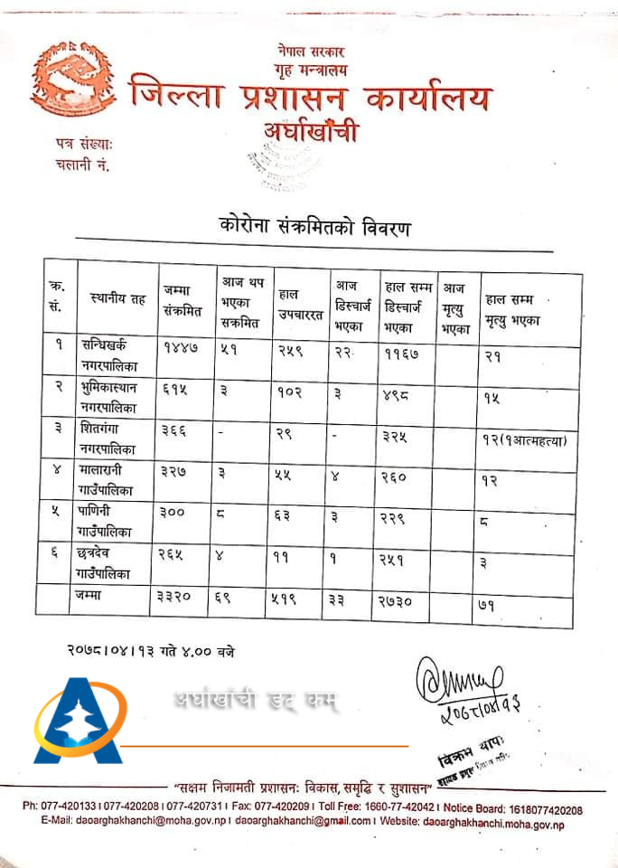 सन्धिखर्क, अर्घाखाँची (अर्घाखाँचीडट्कम) । अर्घाखाँची जिल्लामा पछिल्लो २४ घण्टामा थप ६९ जना कोरोना संक्रमित थपिएका छन् ।