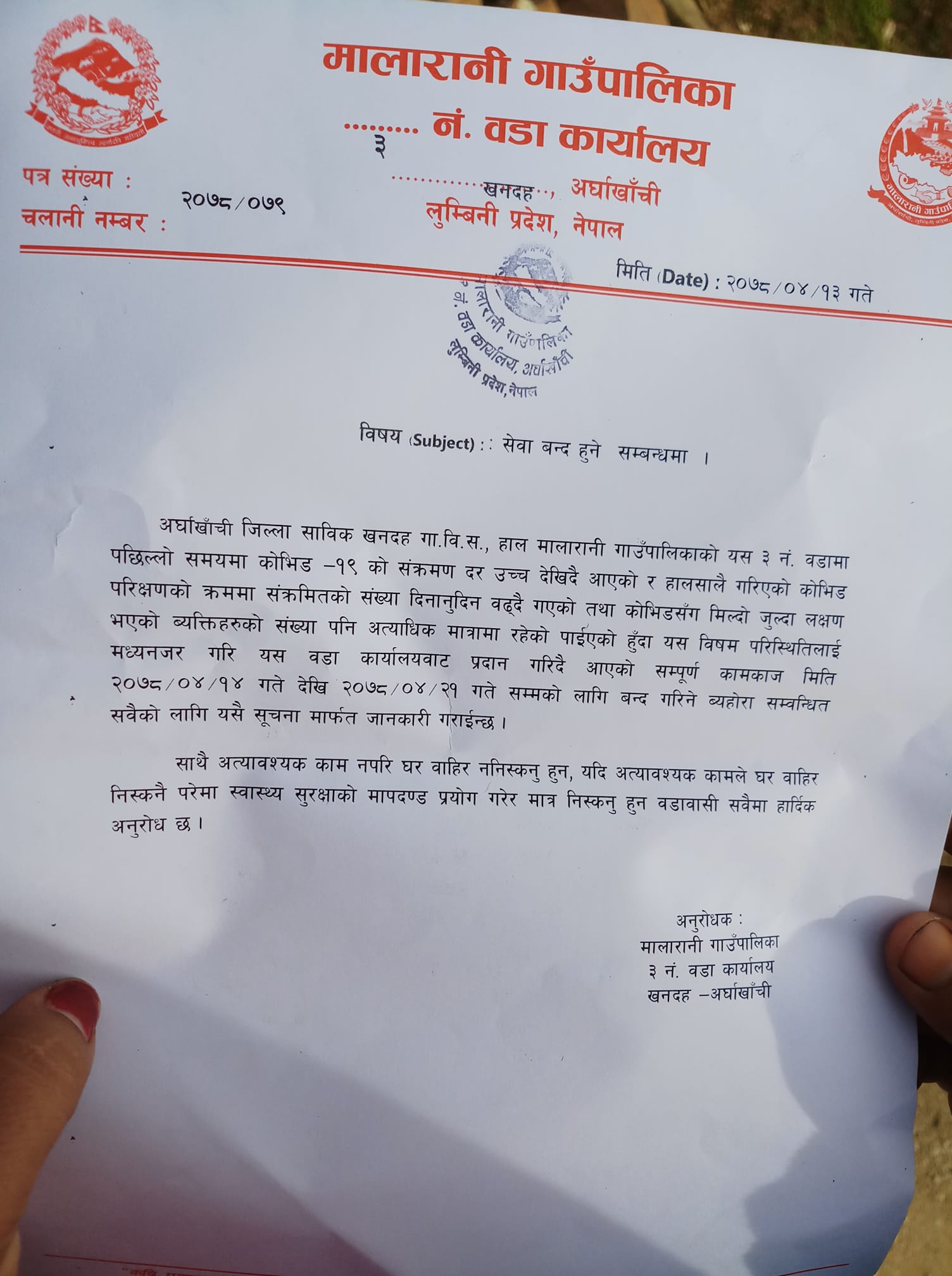 खनदह, अर्घाखाँची (अर्घाखाँचीडट्कम) । अर्घाखाँची जिल्लाको मालारानी गाउँपालिका वार्ड नम्बर ३ खनदहले साउन २१ गतेसम्म निषेधाज्ञा जारी राख्ने भएको छ। जिल्लाभर भने दशौ पटक थपिएको निषेधाज्ञा साउन २० गते आईतबार राती १२ बजेसम्म जारी रहने छ ।
