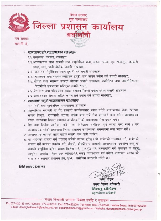 यसअघि दशौ साउन २० गते बुधवार राती १२ बजेसम्म एक हप्ता निषेधाज्ञा थपिएको थियो । अर्घाखाँची लगायत १७ जिल्लामा कोरोनाको उच्च जोखिम रहेको स्वास्थ्य मन्त्रालयको तथ्याङ्कमा उल्लेख छ । यस अगाडि स्वास्थ्य मापदण्ड पालना गरेर सबै यातायात, बैंक तथा वित्तीय संस्था खुलेका थिए ।