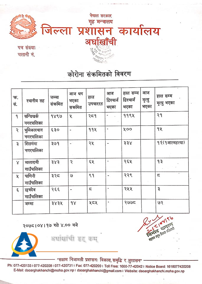 सन्धिखर्क, अर्घाखाँची (अर्घाखाँचीडट्कम) । अर्घाखाँची जिल्लामा पछिल्लो २४ घण्टामा थप १४ जना कोरोना संक्रमित थपिएका छन् ।