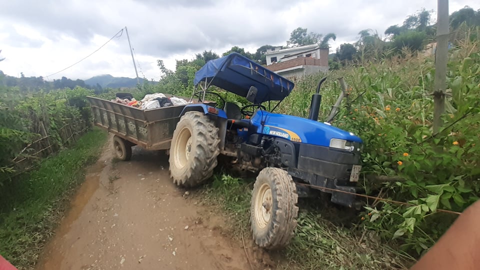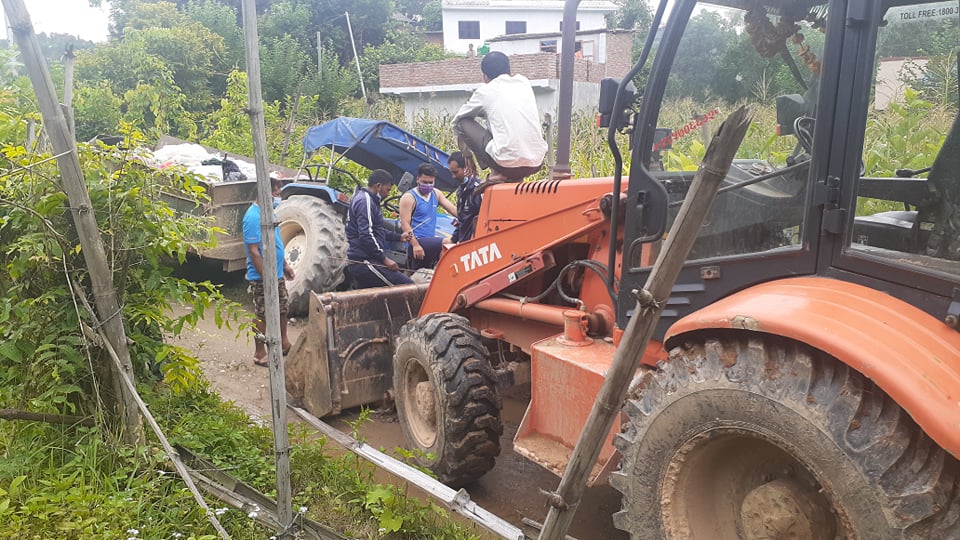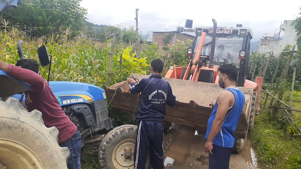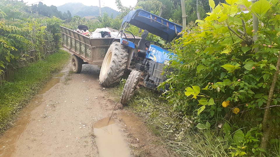 आईतबार संखेटारी साघुरो बाटोमा भलका कारण फोहोर फाल्ने ट्याक्टर छिर्न नसक्दा बाटो मुनि खसेर नगरपालिकाको जेसिबी लगाएर निकालेको थियोे ।