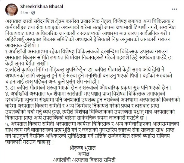 उता अर्घाखाँची अस्पताल बिकास समिती अध्यक्ष श्रीकृष्ण भुसालले अहिले कार्यरत निमित्त मेडिकल सुपरिटेन्डेन्ट डा. कपिल गौतमले केही समय अघि देखि नै अध्ययनको लागि अनुकुल हुने गरि सरुवा हुने मनस्थिती बनाउनु भएको थियो र वहाँको सरुवाको चाहनालाई त्यसपछिका अन्य कुनै प्रसंगसँग नजोडौं भनेता पनि उनले जिल्ला छोड्ने प्रक्रियामा गएको कारण दुर्व्यवहार नै भएको बताइएको छ ।