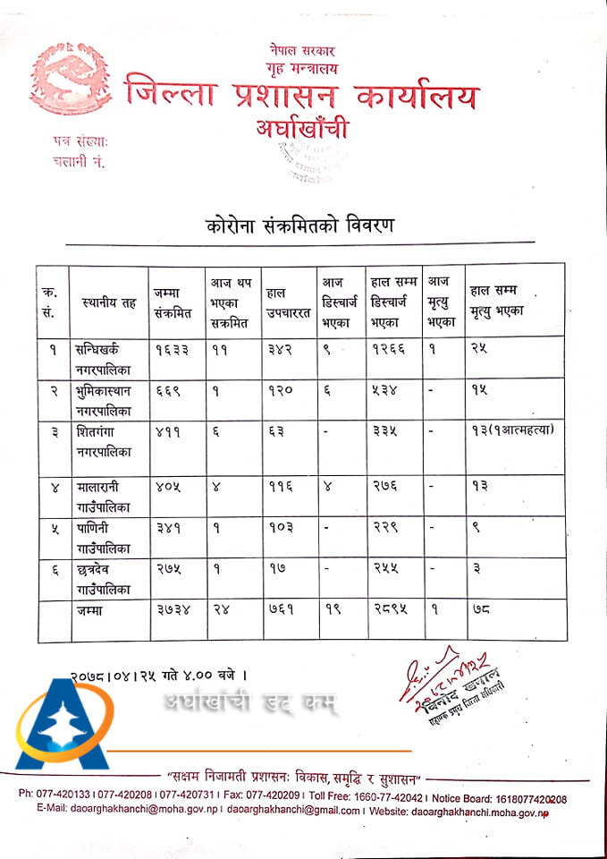 यस्तै जिल्ला प्रशासन कार्यालयका अनुसार काेराेना संक्रमणका कारण जिल्लामा गतवर्षदेखि हालसम्म ७८ जनाको ज्यान गएको छ । जसमा सन्धिखर्क नगरपालिकामा २५ जना, भूमिकास्थान नगरपालिकामा १५, शितगंगा नगरपालिकामा १ जना आत्महत्या सहित १३, मालारानी गाउँपालिकामा १३, पाणिनी गाउँपालिकामा ९ र छत्रदेव गाउँपालिकामा ३ जना संक्रमित रहेका छन् ।