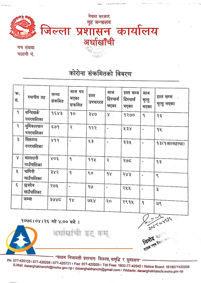 यस्तै काेराेना संक्रमणका कारण जिल्लामा गतवर्षदेखि हालसम्म ८० जनाको ज्यान गएको छ । जसमा सन्धिखर्क नगरपालिकामा २६  जना, भूमिकास्थान नगरपालिकामा १५,    शितगंगा नगरपालिकामा १ जना आत्महत्या सहित १४, मालारानी गाउँपालिकामा १३,  पाणिनी गाउँपालिकामा ९   र छत्रदेव गाउँपालिकामा ३ जना संक्रमित रहेका छन् ।