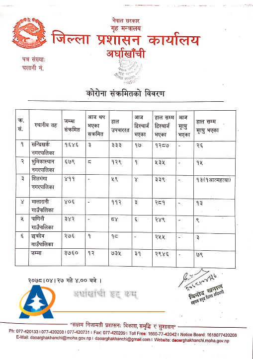 सन्धिखर्क, अर्घाखाँची (अर्घाखाँचीडट्कम) । अर्घाखाँची जिल्लामा पछिल्लो २४ घण्टामा थप १२ जना कोरोना संक्रमित थपिएका छन् ।