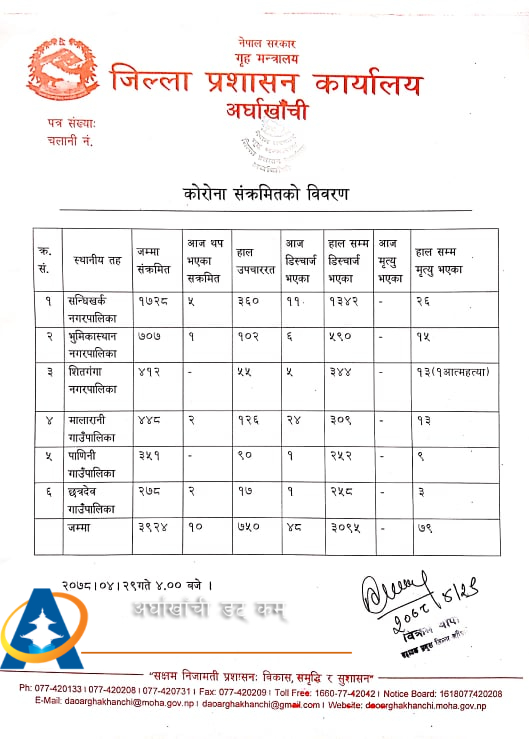 सन्धिखर्क, अर्घाखाँची (अर्घाखाँचीडट्कम) । अर्घाखाँची जिल्लामा पछिल्लो २४ घण्टामा थप १० जना कोरोना संक्रमित थपिएका छन् ।