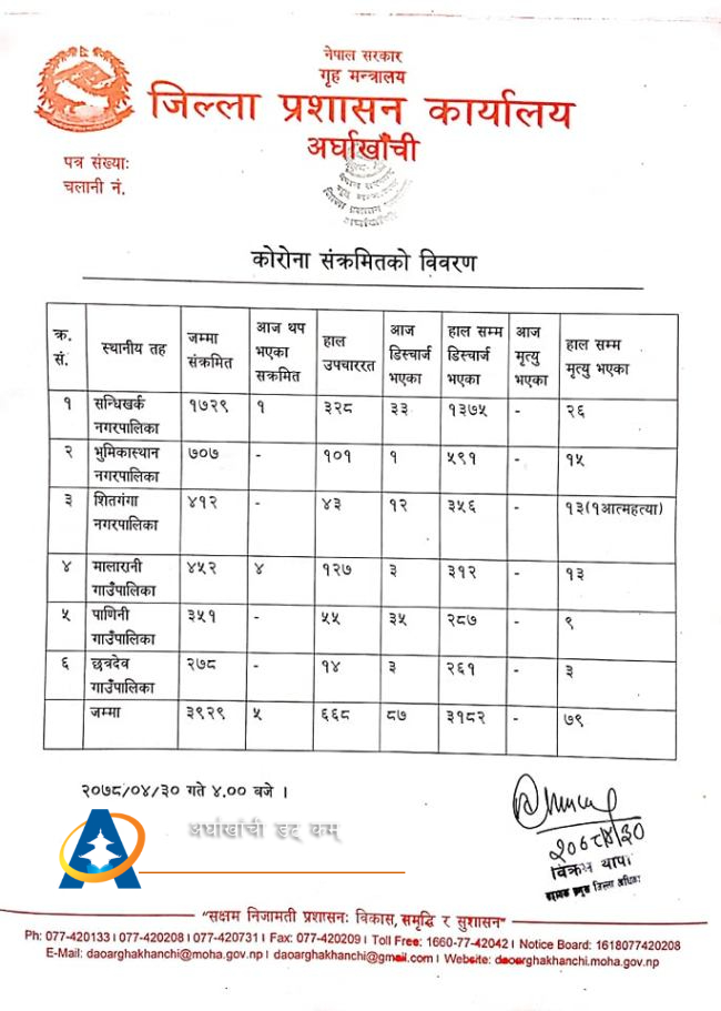 सन्धिखर्क, अर्घाखाँची (अर्घाखाँचीडट्कम) । अर्घाखाँची जिल्लामा पछिल्लो २४ घण्टामा थप ५ जना कोरोना संक्रमित थपिएका छन् ।