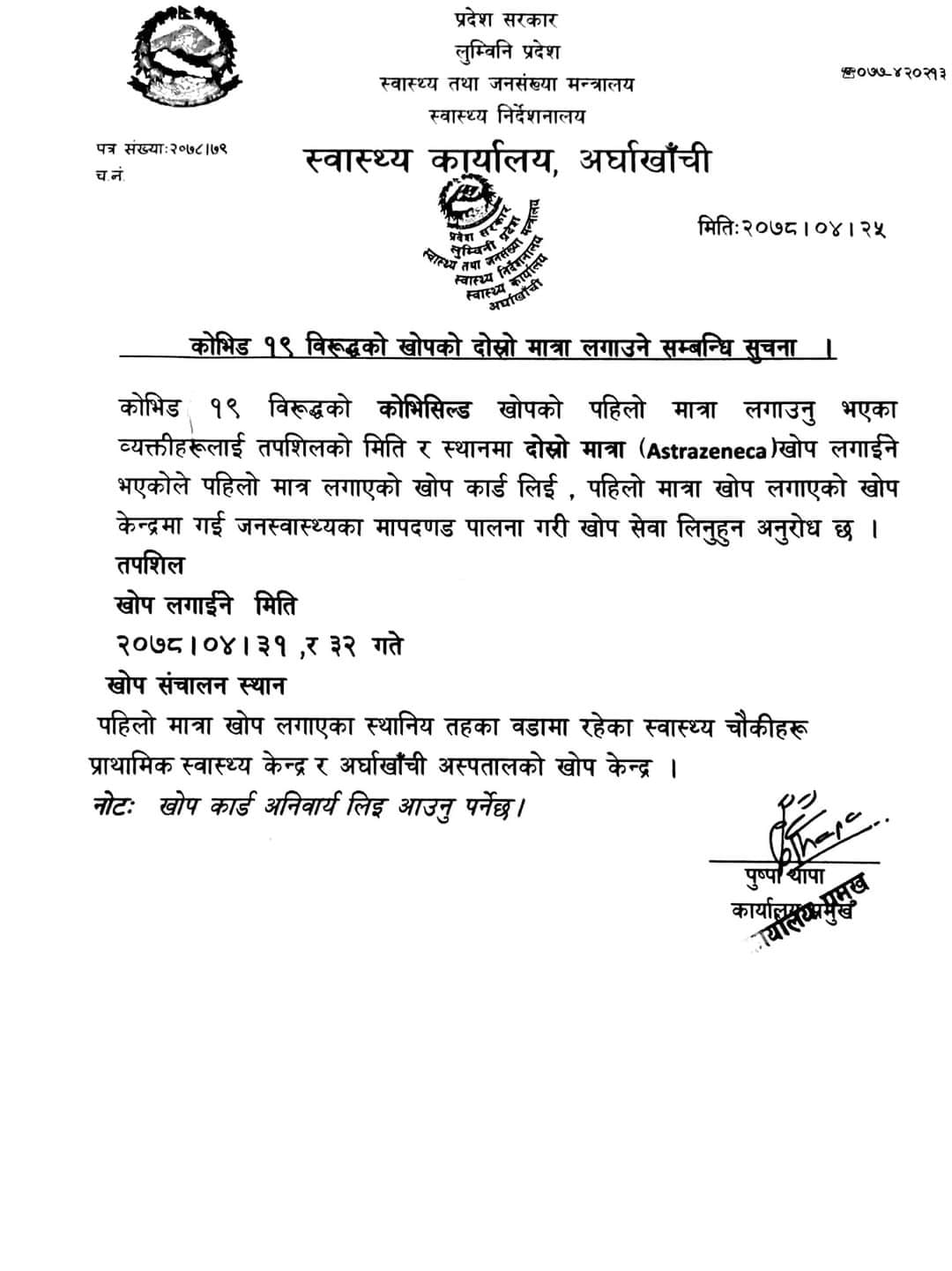 सन्धिखर्क, अर्घाखाँची (अर्घाखाँचीडट्कम) । अर्घाखाँची जिल्लाका सबै खोप केन्द्रमा कोरोना विरुद्धको ‘कोभिशिल्ड’ भोली साउन ३१ र ३२ गते दोस्रो मात्राको खोप लगाइने भएको छ ।