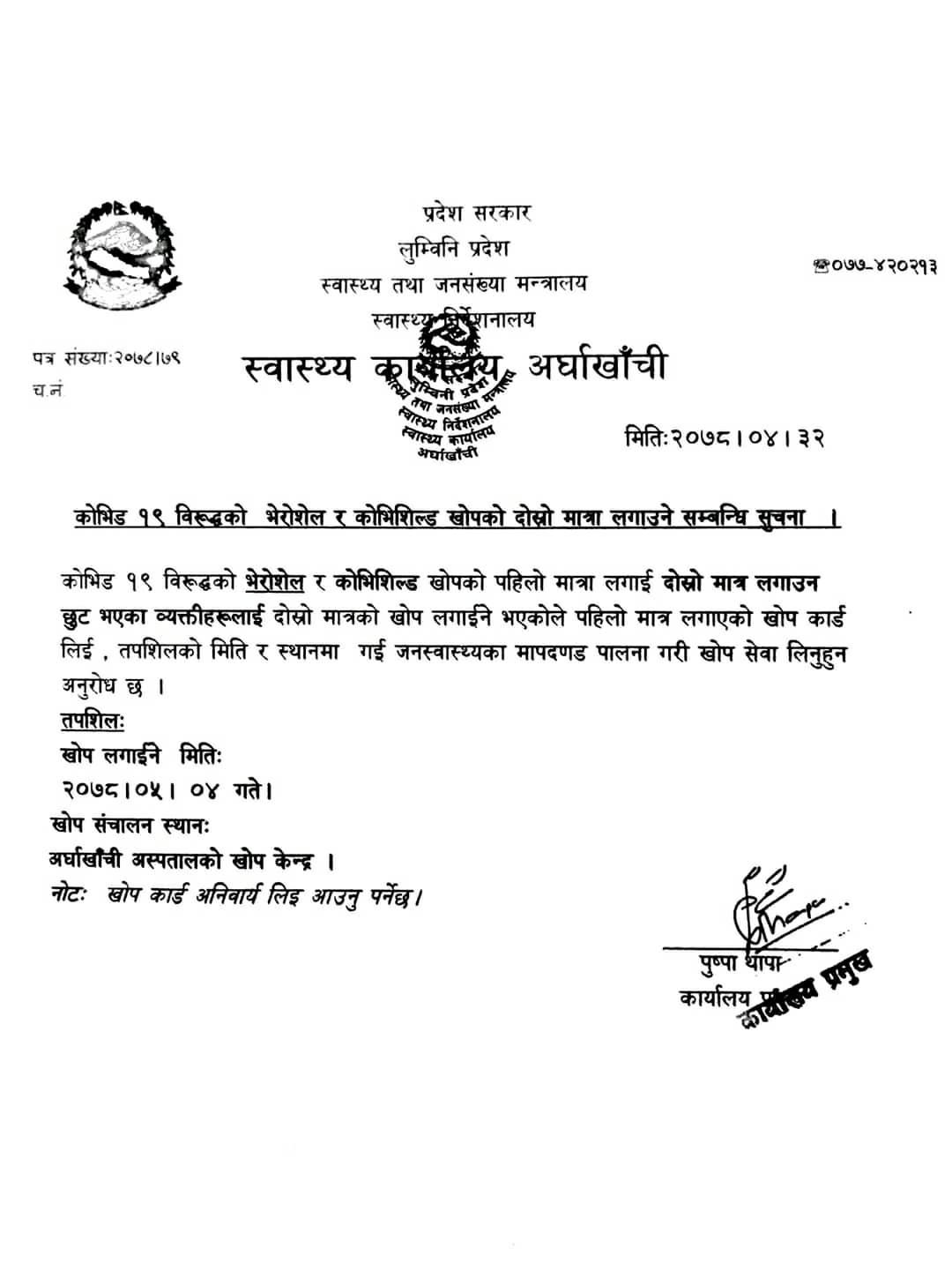 अर्घाखाँची जिल्ला अस्पतालको खोप केन्द्रमा कोरोना विरुद्धको चाईनिज खोप ‘भेरोसेल’ को पहिलो डोज लगाएकालाई साउन २८ र २९ गते र ‘कोभिशिल्ड’ साउन ३१ र ३२ गते दोस्रो मात्राको खोप लगाउन छुटेकाहरुलाई यही भदौ ४ र ५ गते लगाईने भएको हो ।