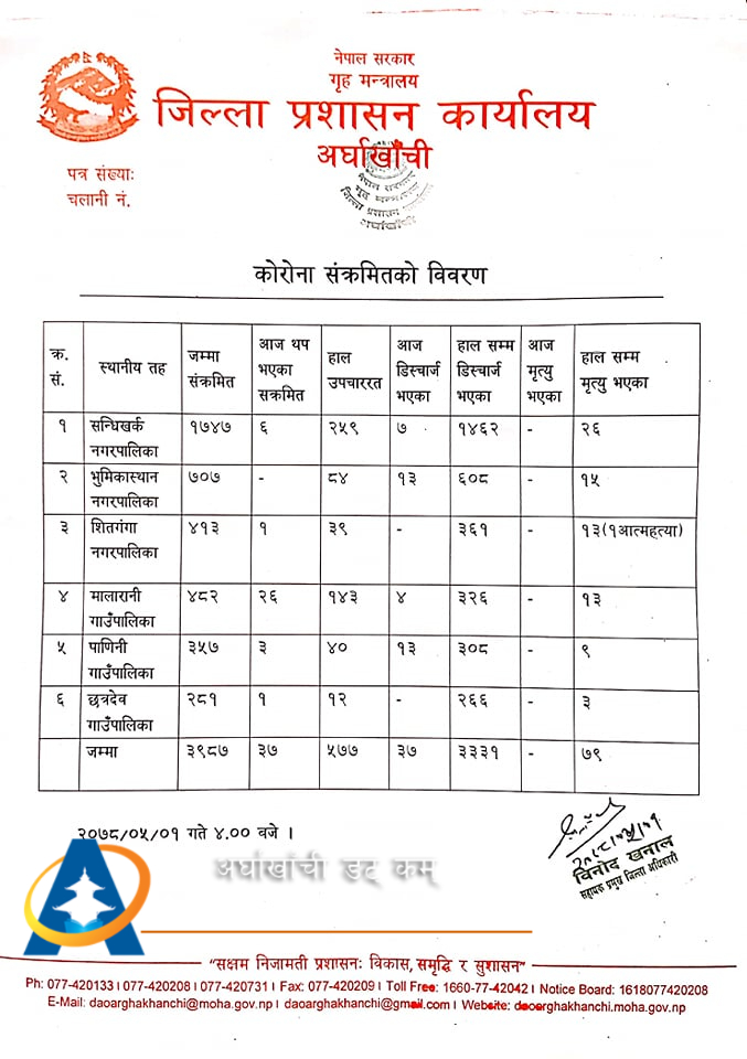 सन्धिखर्क, अर्घाखाँची (अर्घाखाँचीडट्कम) । अर्घाखाँची जिल्लामा पछिल्लो २४ घण्टामा थप ३७ जना कोरोना संक्रमित थपिएका छन् ।