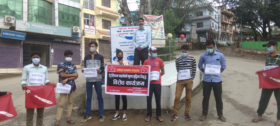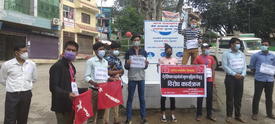 सन्धिखर्क, अर्घाखाँची (अर्घाखाँचीडट्कम) । अर्घाखाँची जिल्लाको सदरमुकाम सन्धिखर्कमा विप्लब नेतृत्वको नेपाल कम्युनिस्ट पार्टीको भातृ संगठन अनेरास्ववियु क्रान्तिकारी जिल्ला समिति अघांखाँचीले बतंमान सरकारले गरेको प्रटाेलियम पदार्थको विराेध गरेको छ ।