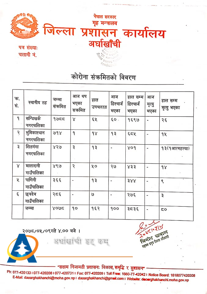सन्धिखर्क, अर्घाखाँची (अर्घाखाँचीडट्कम) । अर्घाखाँची जिल्लामा पछिल्लो २४ घण्टामा थप १० जना कोरोना संक्रमित थपिएका छन् ।