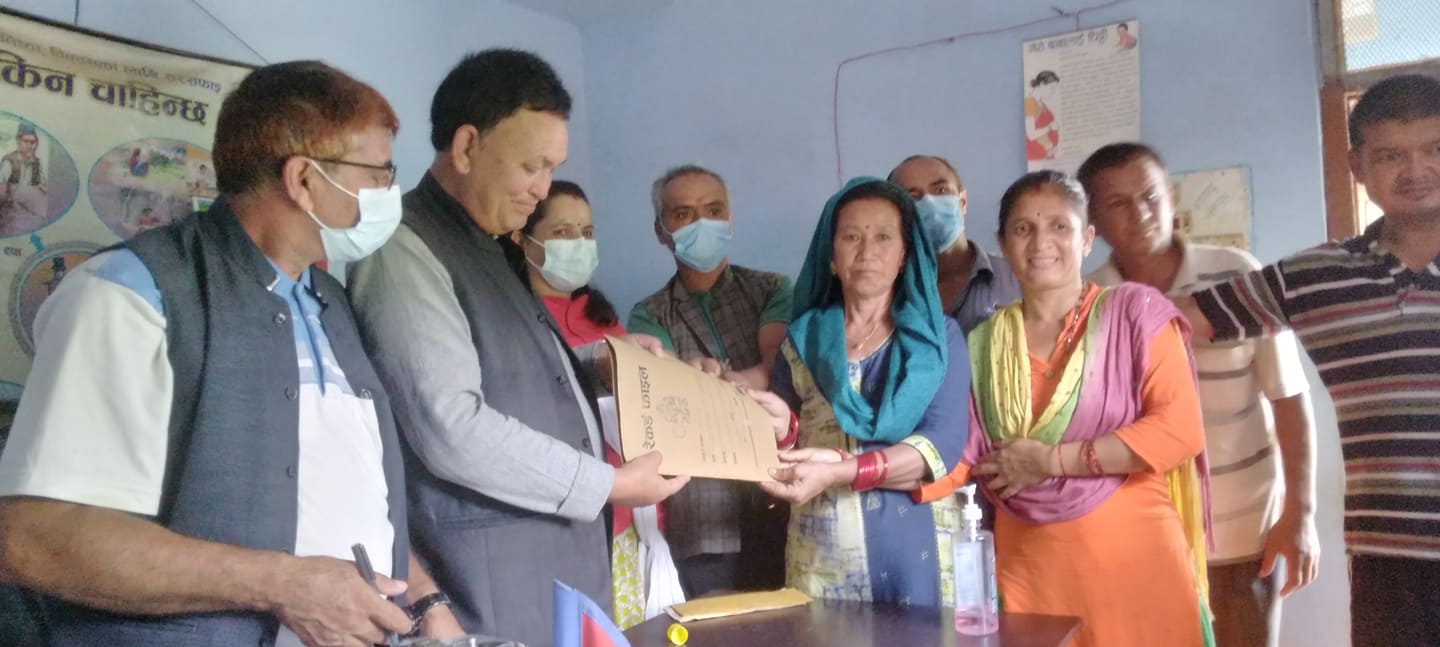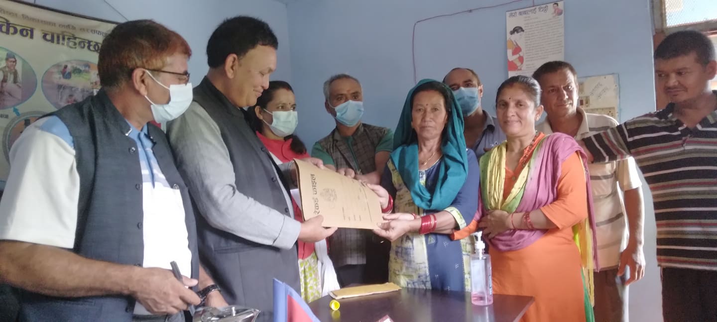 खाँचीकोटका श्याम क्षेत्रीकाे असामयिक निधन भएपछि विमा कम्पनीले ७ लाख ६८ हजार ९४ रुपैयाँकाे चेक घरमै लगेर श्रीमती राधा क्षेत्रीलाई हस्तान्तरण गरेको हाे ।