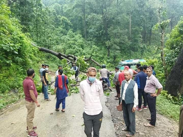 पत्थरकोट माथि ठाडाको काेन्द्रे खाेलामा बिहीवार अपरान्ह सवा ३ बजेतिर सालकाे रुख ढल्दा सन्धिखर्क गाेरुसिंगे सडक अवरुद्ध भएकाे थियो ।