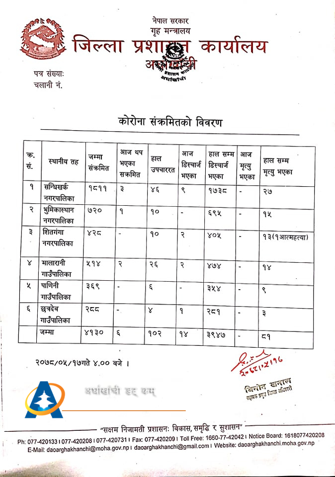 सन्धिखर्क, अर्घाखाँची (अर्घाखाँचीडट्कम) । अर्घाखाँची जिल्लामा पछिल्लो २४ घण्टामा थप ६ जना कोरोना संक्रमित थपिएका छन् ।