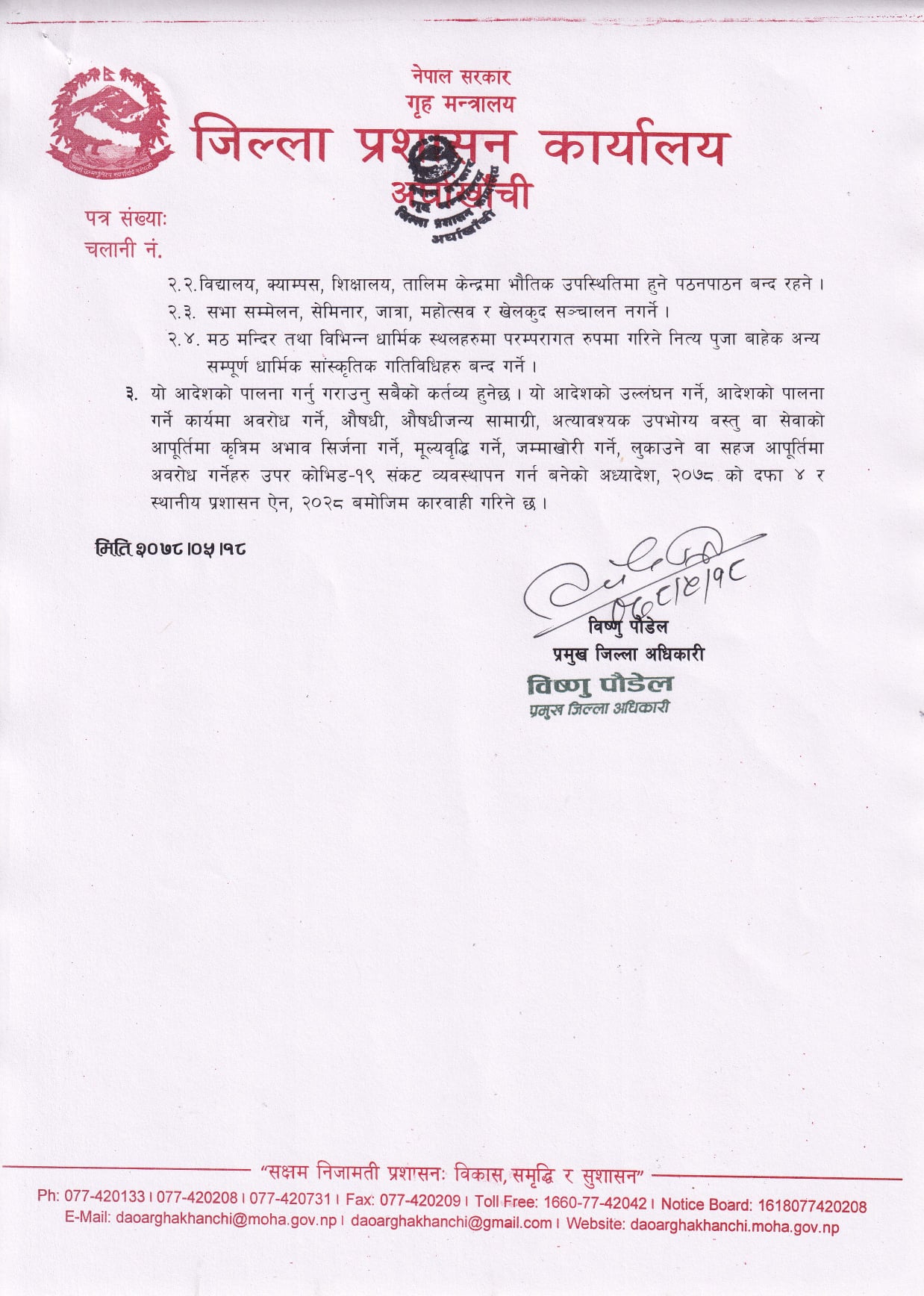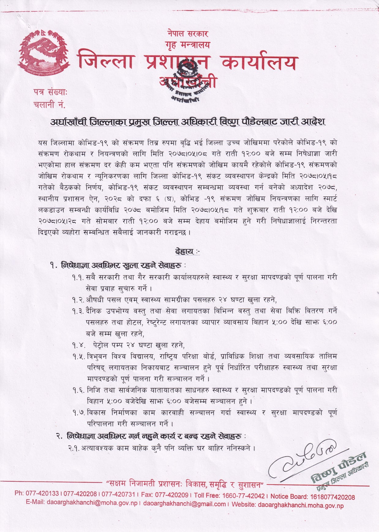 प्रमुख जिल्ला अधिकारी बिष्णु पौडेलको अध्यक्षतामा कोभिड-१९ संकट व्यवस्थापन केन्द्र(डीसीसीएमसी) अर्घाखाँचीको सन्धिखर्कमा बसेको बैठकले भीडभाड हुने क्षेत्रमा अझै भाद्र २८ गते सोमबार राती १२:०० बजेसम्म रोक लगाउने गरी अन्य सबै खोल्ने निर्णय गरेको हो ।