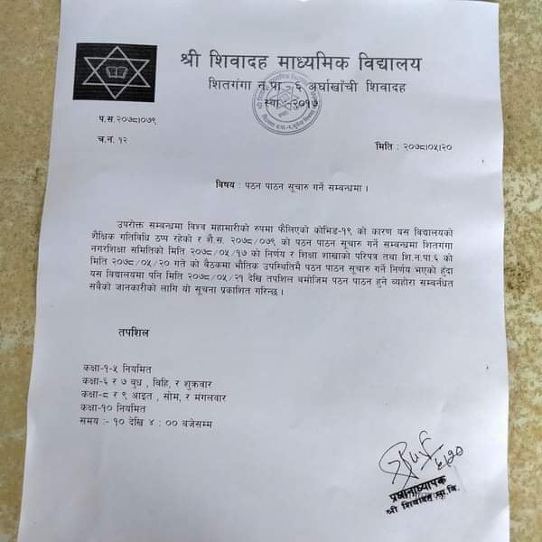 शितगंगा नगरपालिकामा नगर शिक्षा समिती र शिक्षकहरुको पेशागत संगठनको बिहीवार बसेको बैठकले सम्पूर्ण विद्यालयहरूमा आज भाद्र २० गते आईतबारदेखि खुलाउने निर्यण गरेको थियो ।