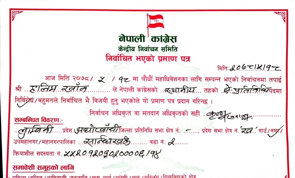 नेपाल बिद्यार्थी संघ नगर सदय तथा २ बर्षदेखि राजनीतिमा सक्रिय हलिम खान क्षेत्रीय प्रतिनिधिमा निर्विरोध निर्वाचित भएका हुन् ।
