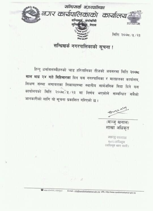 ति पालिका तथा वार्ड कार्यालय अन्तर्गतका कार्यालयमा बिदा दिने निर्णय भएको सुचना मार्फत जानकारी गराएका छन् ।
