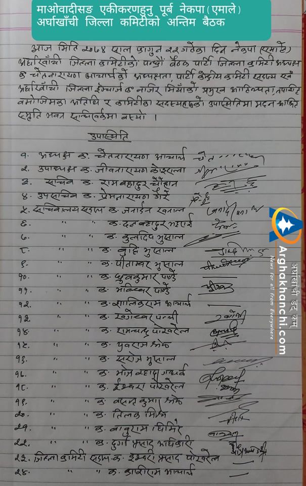 सन्धिखर्क, अर्घाखाँची (अर्घाखाँचीडट्कम) । अर्घाखाँची जिल्लामा नेकपा (एमाले) को १० बुँदे सहमति कार्यान्वयन गर्न सहमत भएको छ ।