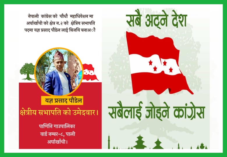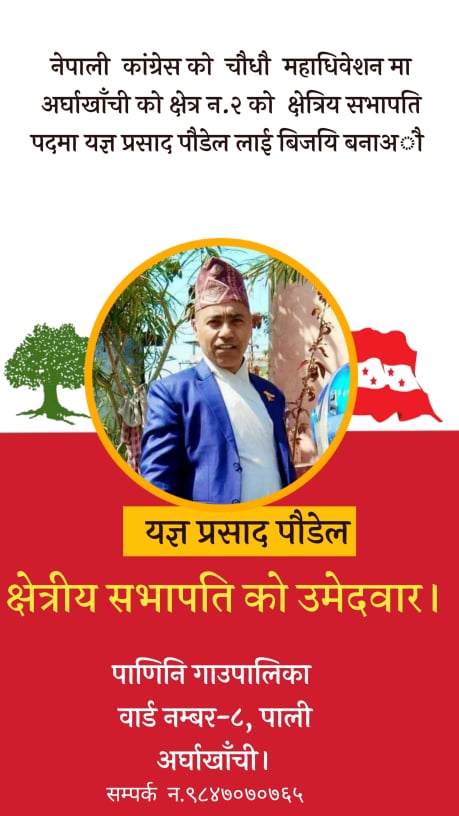पाली, अर्घाखाँची (अर्घाखाँचीडट्कम) । नेपाली कांग्रेसको १४ औं महाधिवेशन अन्तगर्त अर्घाखाँची जिल्लाको पाणिनी गाउँपालिका वार्ड नम्बर ५ पालीका कांग्रेसका युवा नेता यज्ञ प्रसाद पौडेलले अर्घाखाँची जिल्ला क्षेत्र नम्बर २ को क्षेत्रीय सभापतिमा उम्मेदवारी दिने भएका छन् ।