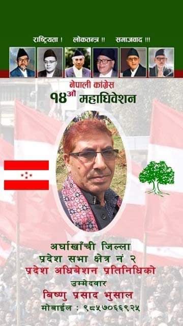 खाँचीकोट, अर्घाखाँची (अर्घाखाँचीडट्कम) । अर्घाखाँची जिल्लाको सन्धिखर्क नगरपालिका वार्ड नं. ७ खाँचीकोटका युवा नेता बिष्णु भुसालले नेपाली कांग्रेसको प्रदेश सभा क्षेत्र नम्बर २ अधिवेशनमा प्रदेश प्रतिनिधि सदस्यमा उम्मेद्बारी दिने घोषणा गरेका छन् ।