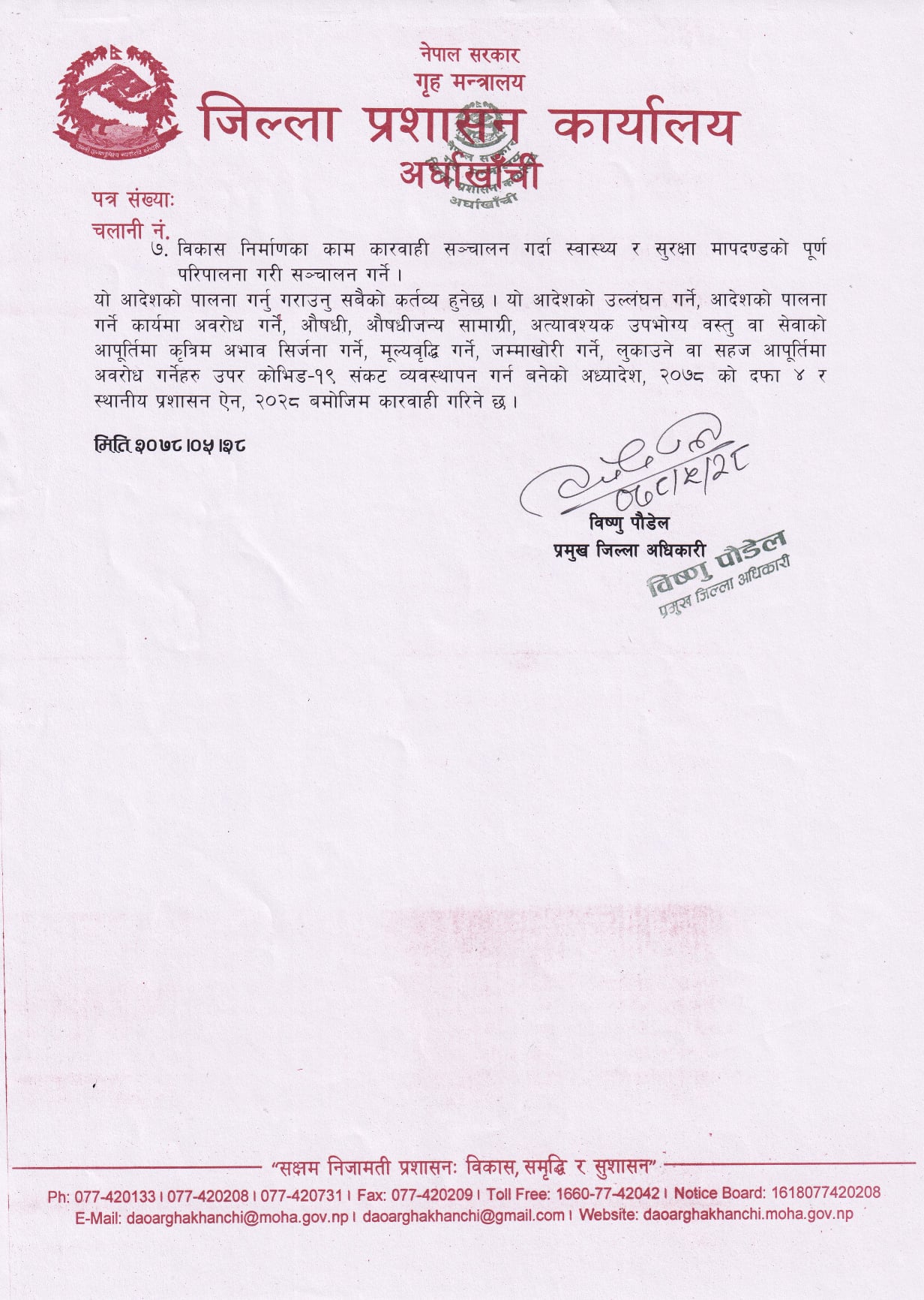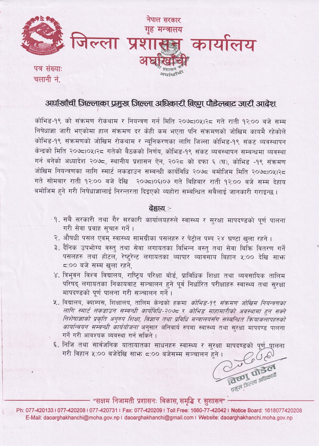 प्रमुख जिल्ला अधिकारी बिष्णु पौडेलको अध्यक्षतामा कोभिड-१९ संकट व्यवस्थापन केन्द्र(डीसीसीएमसी) अर्घाखाँचीको सन्धिखर्कमा बसेको बैठकले भीडभाड हुने क्षेत्रमा अझै असोज ७ गते बिहीवार राती १२:०० बजेसम्म रोक लगाउने गरी अन्य सबै खोल्ने निर्णय गरेको छ ।