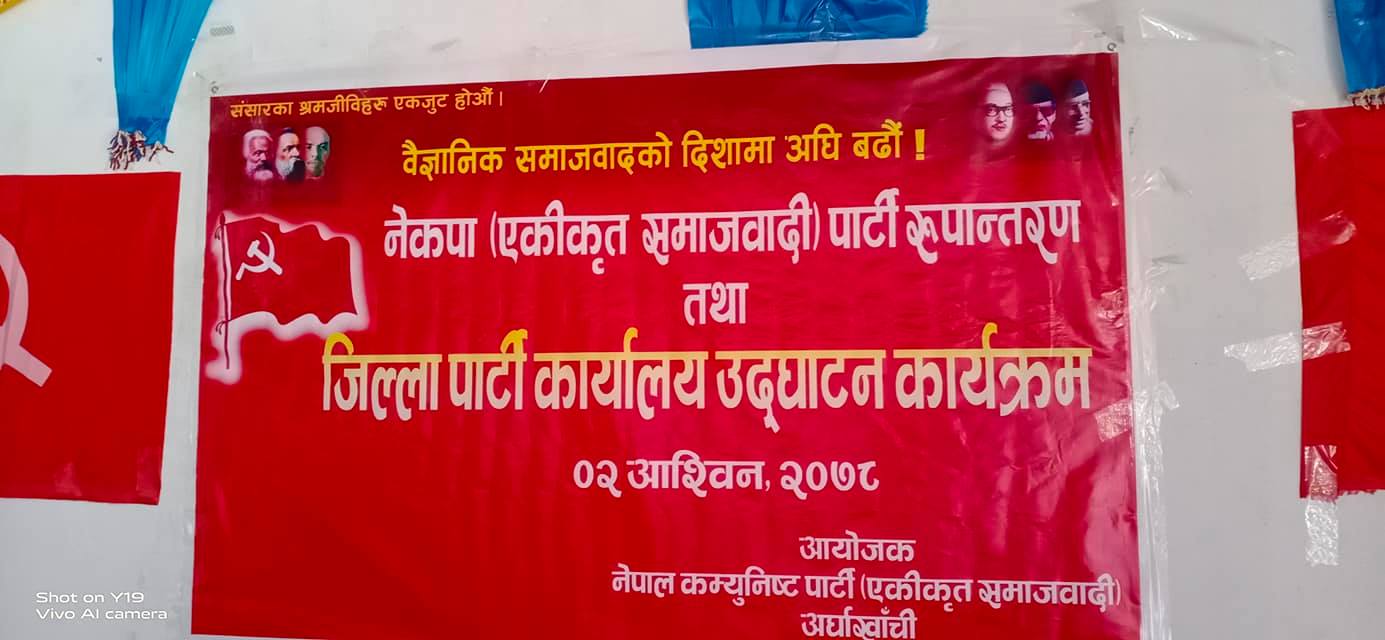 सन्धिखर्क, अर्घाखाँची (अर्घाखाँचीडट्कम)। अर्घाखाँची जिल्लाको सदरमुकाम सन्धिखर्कमा नेकपा (एकीकृत समाजवादी) को पार्टी कार्यालय उद्घाटन तथा कमिटी रुपान्तरण कार्यक्रम सम्पन्न भएको छ ।
