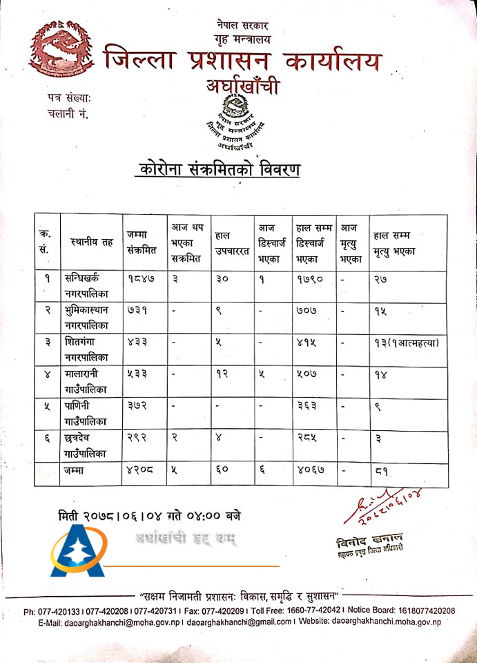 सन्धिखर्क, अर्घाखाँची (अर्घाखाँचीडट्कम) । अर्घाखाँची जिल्लामा पछिल्लो २४ घण्टामा थप ५ जना कोरोना संक्रमित थपिएका छन् ।