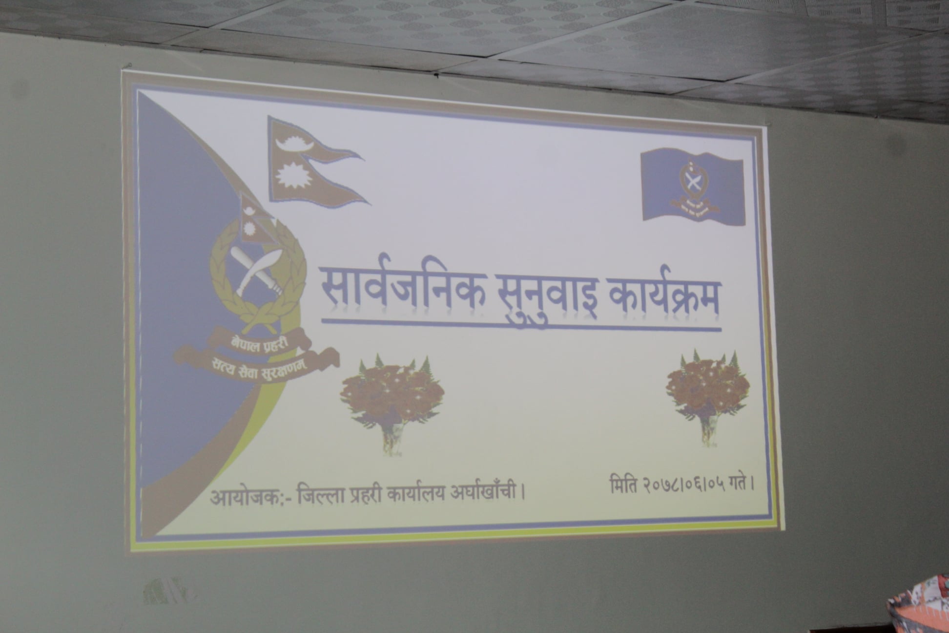 सन्धिखर्कमा मंगलवार जिल्ला प्रहरी कार्यालयले सार्वजनिक सुनुवाई कार्यक्रम  सम्पन्न  गरेको हो ।